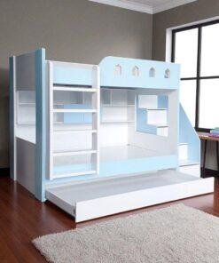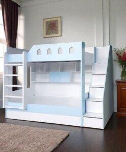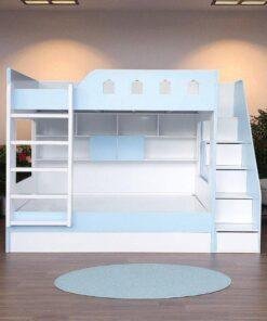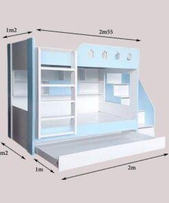 Chiếc giường tầng này là sự kết hợp hoàn hảo giữa giường ngủ, bàn học, giá sách và tủ quần áo. Tầng trên là không gian nghỉ ngơi an toàn với lan can chắn chắc chắn, được cách điệu như một lâu đài cổ tích, khơi gợi trí tưởng tượng của trẻ. Tầng dưới rộng rãi, có thể sử dụng làm giường ngủ thứ hai hoặc khu vực vui chơi. Đặc biệt, sản phẩm còn tích hợp một ngăn kéo lớn phía dưới, có thể kéo ra thành một chiếc giường phụ, cực kỳ tiện lợi khi có khách đến chơi hoặc cho những gia đình có nhiều con.